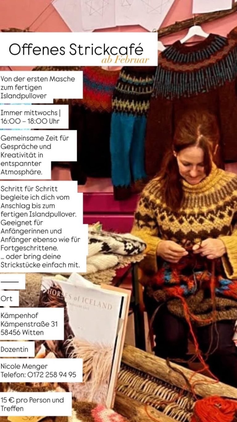 Gemeinsame Zeit für Gespräche und Kreativität in entspannter Atmosphäre. Schritt für Schritt begleite ich dich vom Anschlag bis zum fertigen Islandpullover. Geeignet für AnfängeInnen und Fortgeschrittene. (15€ pro Person und Treffen)